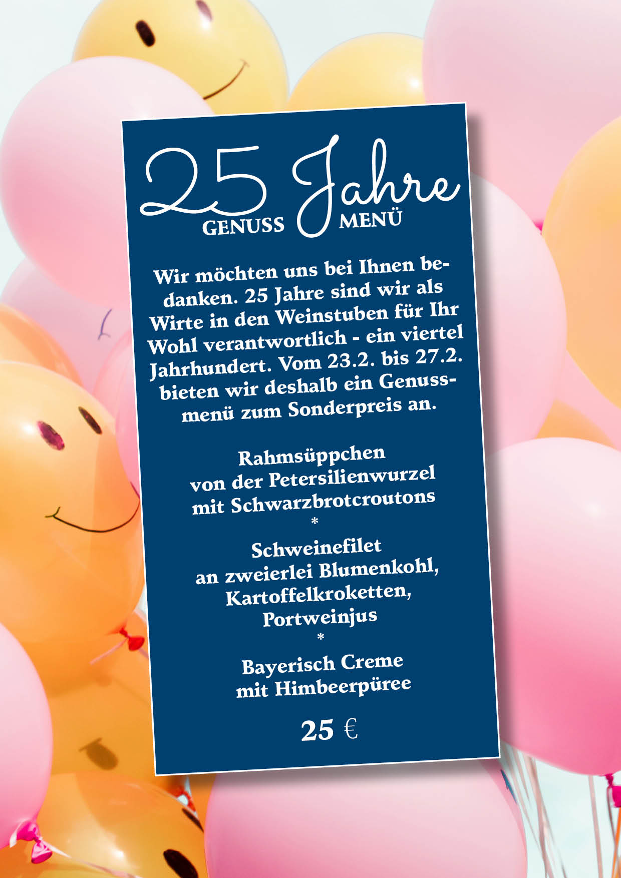 Mit unserem Weinstuben-Brief halten wir Sie auf dem Laufenden. Sie bekommen alle Infos zu unserem monatlichen Mittagstisch. Veranstaltungen, saisonalen Spezialitäten und besonderen Öffnungszeiten. Normalerweise melden wir uns einmal im Monate bei Ihnen.